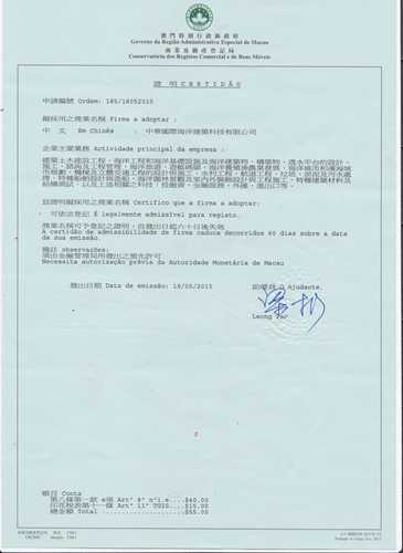中华国际海洋建筑科技有限公司在澳门政府注册证明文件