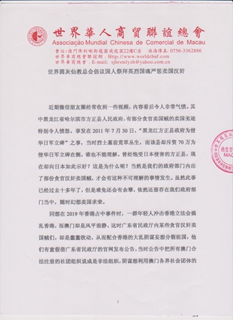 因为本会曾经在2018年8月6日在澳门,代表世界华人华商,以“世界圆灰仙教慈善总会”的名誉,请来圆灰仙教的高功法师,专门为“中华国共两党抗日英烈”超度奉仙,把在抗日时期为国牺牲的英烈全部奉为『铁血正气、护国游仙』,又于2019年4月26日为“中华人民英烈”超度奉仙,把在我国八千年的历史长河中,在维护中华民族独立、国家统一、领土完整,而战斗牺牲的“中华人民英烈”和在我国建国前后,为保家卫国而战斗牺牲的所有“人民英烈”,以及在我国各领域,有巨大杰出贡献的“中华人民英烈”全部敬奉为神仙,奉为『铁血正气、忠烈游仙』,为他们树碑立传让世人永远能够缅怀他们生前的功迹! 因此才触动了这些国际反华势力、贪官汉奸们的逆麟,所以他们借助广东省民政厅的名誉公开诬蔑本会“世界圆灰仙教慈善总会”和澳门一部分合法注册的民间社团组织为非法组织,以图打压本会及澳门的一些爱国民间团体,从而达到他们分裂祖国的目的,为此我们坚决不答应,必须与他们抗争。他们越害怕全国人民祭拜敬仰人民英烈国魂,我们越要经常祭拜我们的民族英雄中国的国魂。在此本会“世界圆灰仙教慈善总会”、“国际华人同乡联合总会”、“世界华人商贸联谊总会”、“世界易经联合总会”、“中华养生科研总会”、“世界弘扬关公文化总会”、“中国澳门台海爱心促进会”、“中国澳门爱民促进会”八间社团组织联合倡议:我们坚决拥护党中央习近平主席提出的中国梦,打造人类命运共同体的方针。我们一定要团结世界华人跟随党中央的步伐,敬天爱人,永远敬仰,愐怀,祭奠我们华夏人民英烈国魂,打倒企图分裂祖国的贪官汉奸卖国贼! 永远关心民众疾苦,为早日实现祖国统一,实现人类互帮﹑互助﹑共赢﹑共生而努力奋斗!