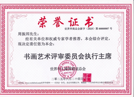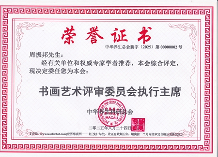 经有关单位和权威书画养生专家学者推荐,本会“世界华人商贸联谊总会”、“中华养生科研总会”两总会总监督委员会研究决定,委任“全球华人华商联合总会”名誉主席、“世界华人商贸联谊总会书画艺术研究院”名誉院长、“中央书画艺术研究院”副院长兼广东分院院长、“周啸虎美术馆”馆长、“中国书画家协会”常务理事、“中华清风书画协会”广东会长、“孙中山博爱基金会”书画大师、“中华宋庆龄国际基金会”书画大师、“广东振邦文化发展有限公司”董事长、“广州周啸虎文化发展有限公司”总经理周振邦先生,为本会“世界华人商贸联谊总会书画艺术评审委员会”执行主席,同时委任周振邦先生,为本会“中华养生科研总会书画艺术评审委员会”执行主席。