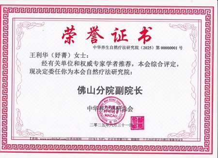 经有关单位和权威专家推荐,委任“广东省佛山百依健美容有限公司”董事长王利华(妤菁}女士,为本会“中华养生科研总会”自然疗法研究院广东省佛山分院副院长。