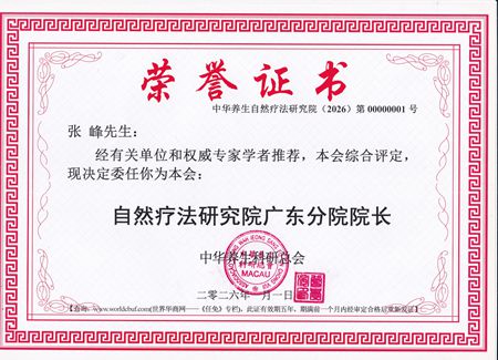 经有关单位和权威专家推荐,委任“世界华人商贸联谊总会一带一路经济建设促进会” 珠海分会副理事长、“国际华人同乡联合总会张氏宗亲联合会”理事长张峰先生,为本会“中华养生科研总会”自然疗法研究院广东分院院长。 特此为证!