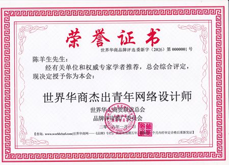 经有关单位和权威专家推荐,“世界华人商贸联谊总会品牌评审推广委员会”考核评定,授予“珠海市锐奇网络有限公司”网络设计师、“江西省赣州市网络设计师”、“江西省赣州云食品机械网络推广员”、“世界华人商贸联谊总会新型互联网产业联合会”副主席陈羊生先生,为本会“世界华商杰出青年网络设计师”荣誉称号。 特此为证!
